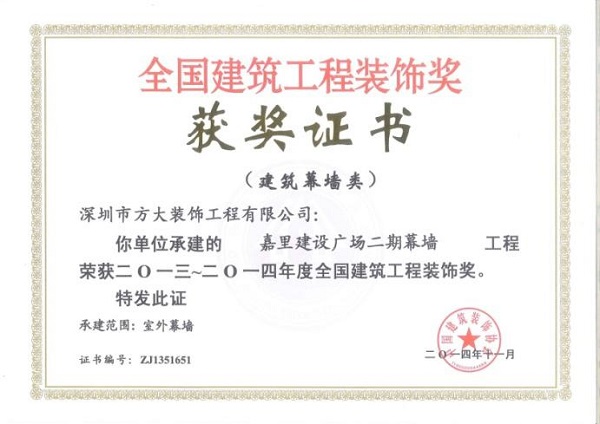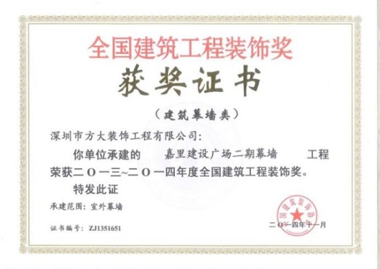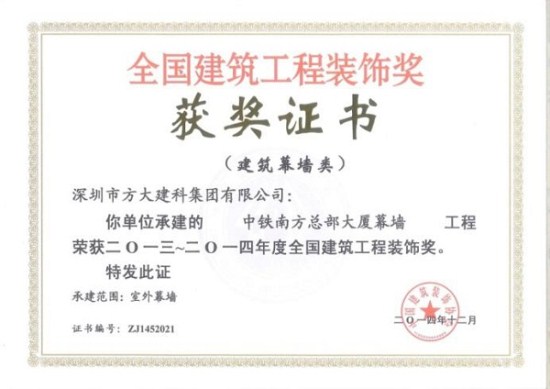 “2013-2014年度全國建筑工程裝飾獎”獲獎結(jié)果在北京揭曉,深圳市方大建科集團(tuán)有限公司榮獲四項建筑幕墻類大獎,獲獎項目分別為:中鐵南方總部大廈幕墻工程、大連萬達(dá)公館1#樓幕墻工程、嘉里建設(shè)廣場二期幕墻工程、中廣核大廈幕墻工程。