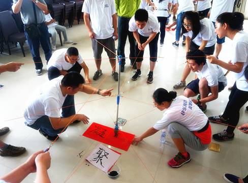 活動需要大家協作配合共同用繩子拉住一只巨大的毛筆來完成各種風格的書法作品。需要團隊成員充分發揮自身優勢在協作中主動承擔不同的角色并積極主動的進行溝通,每一幅作品都是團隊智慧與隊員個性的融合。
